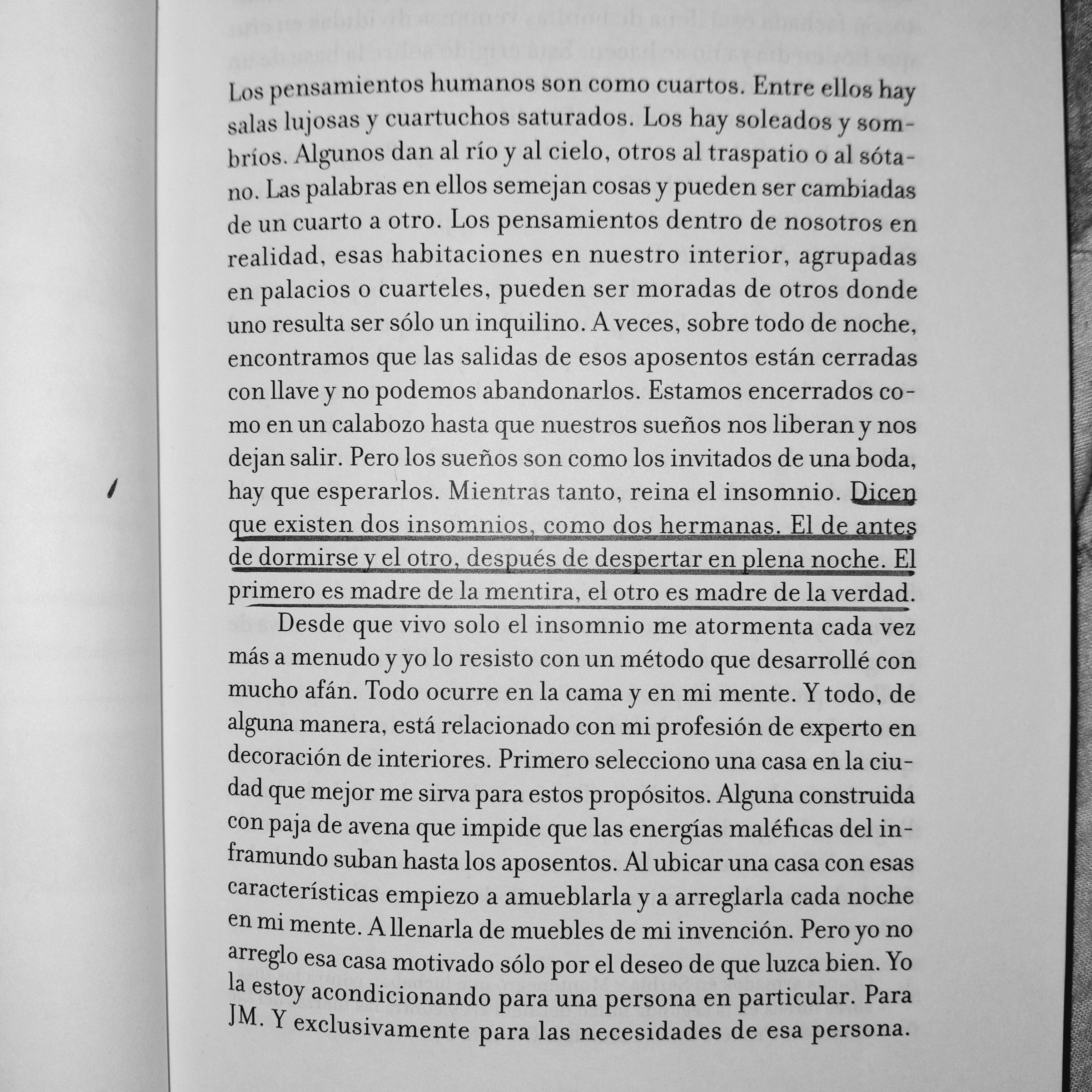 A un exiliado le parece que el estado de exilio tiene la estructura de un sueño. De repente, como en un sueño, aparecen unas caras de las que se había olvidado, que quizá nunca había visto, unos lugares que seguramente ve por primera vez, pero que le parece que le suenan de algo. El sueño es un campo magnético que atrae imágenes del pasado, del presente y del futuro. Al exiliado se le aparecen de repente, despierto, caras, acontecimientos e imágenes atraídos por el campo magnético del sueño; de repente le parece que su biografía ha sido escrita mucho antes de que se cumpla y que, por lo tanto, el exilio no es resultado de las circunstancias externas, ni es elección propia, sino que son coordenadas confusas que el destino había trazado para él desde hace mucho. Atrapado en este dulce y apasionante pensamiento, el exiliado empieza a descifrar las señales confusas, las crucecitas y los nuditos, y de repente le parece que en todo esto lee una secreta armonía: la lógica redonda de los símbolos». pp. 359-360.